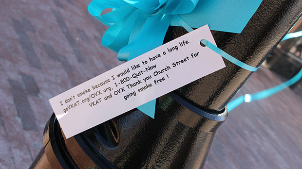 In Burlington, students from Hunt and Edmunds Middle Schools involved in VKAT decorated the lamp posts on Church Street with blue ribbons that shared messages the students wrote about why they choose not to smoke. The messages also thanked Burlington for the new smoke free ordinance on Church Street that is helping to reduce exposure to secondhand smoke, youth tobacco use, and supporting health in Burlington.