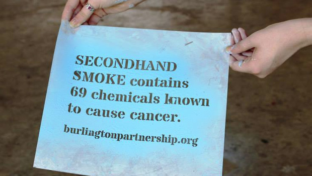 Chalk the message! We use non-toxic washable spray chalk (that washes away in the rain or with a little soap and water) to help educate the community about the health risks of exposure to secondhand smoke. To show your support, sign up to volunteer with us and help chalk stencil at more locations around Burlington OR call us to chalk at your business location! Contact us if you would like to help support us. We receive permission before chalking at any business or public property.