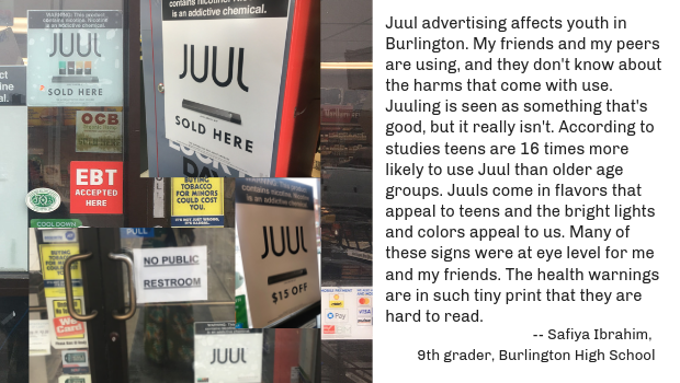 The tobacco industry spends nearly $1 million per hour to market their products. Exposure to retail marketing and other advertising encourages smoking and undermines quit attempts. This is happening nationwide, including right here in Burlington! Did you know there are 22 tobacco retailers within a half mile of Edmunds Middle School? This is a problem for our community because schools with a high number of tobacco retailers within walking distance of a school have a higher prevalence of youth smokers.